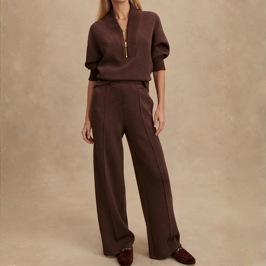 Realizzato in un morbido materiale premium, liscio sulla pelle e capace di mantenere la forma con naturalezza, questo completo unisce praticità e raffinatezza. La maglia con mezza zip valorizza il décolleté con discrezione, mentre i pantaloni ampi creano una linea armoniosa e comodissima da indossare. Almira è un capo che non segue le mode: le interpreta con delicatezza, diventando un essenziale senza tempo per ogni giornata.
